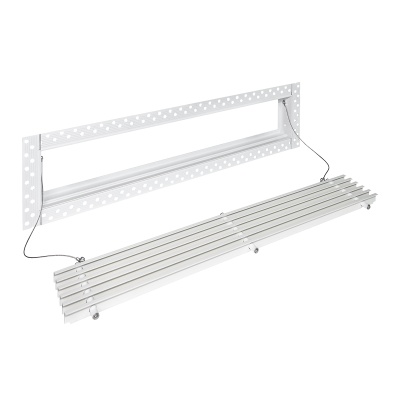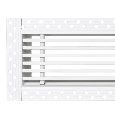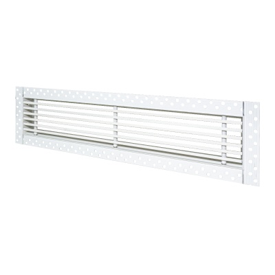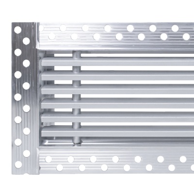 Данная решетка подходит для монтажа на любую поверхность под финишную отделку. Рамка и экран изготовлены из алюминия, опора экрана - из оцинкованной стали. Рама оснащена «полкой» 1,9 мм и рифлеными краями для большей адгезии финишного материала – шпатлевки, цемента. Решетка имеет съемную центральную часть с фиксированным углом наклона ламелей 0°. Она крепится к корпусу прочными металлическими тросиками, легко снимается для очистки и удобного обслуживания.