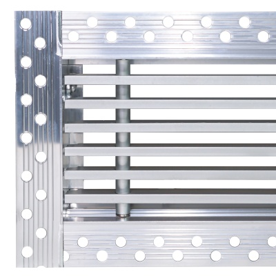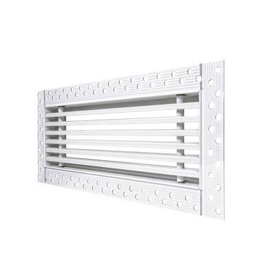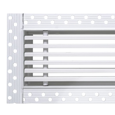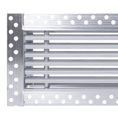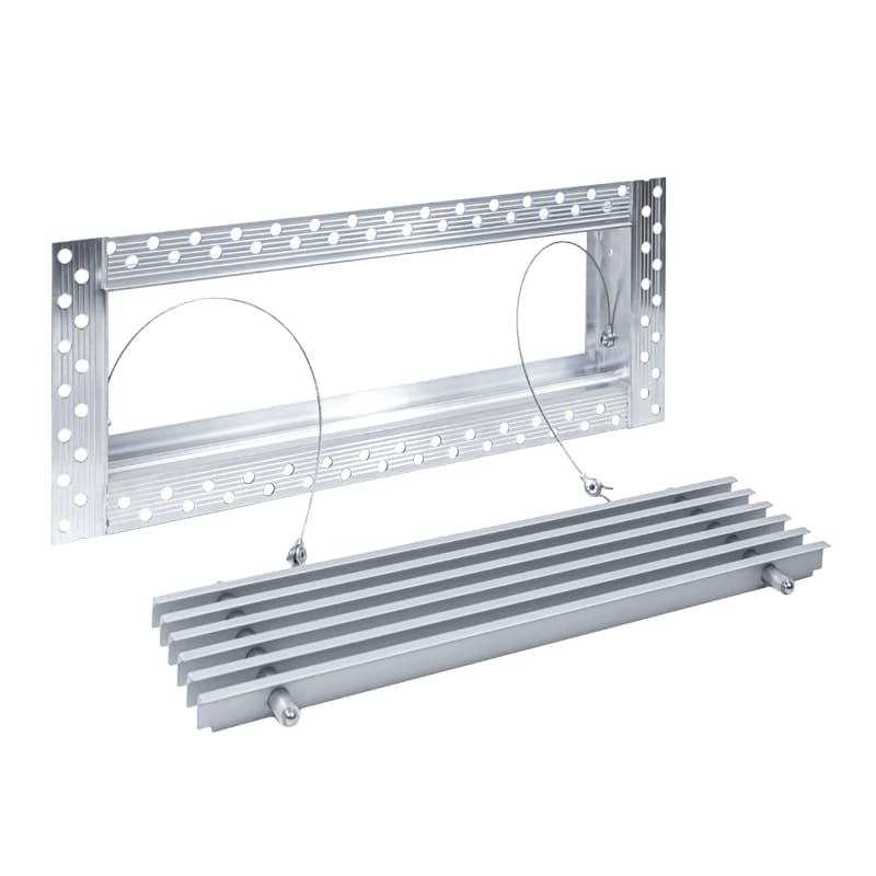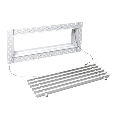 Данная решетка подходит для монтажа на любую поверхность под финишную отделку. Рамка и экран изготовлены из алюминия, опора экрана - из оцинкованной стали. Рама оснащена «полкой» 1,9 мм и рифлеными краями для большей адгезии финишного материала – шпатлевки, цемента. Решетка имеет съемную центральную часть с фиксированным углом наклона ламелей 15°. Она крепится к корпусу прочными металлическими тросиками, легко снимается для очистки и удобного обслуживания.
